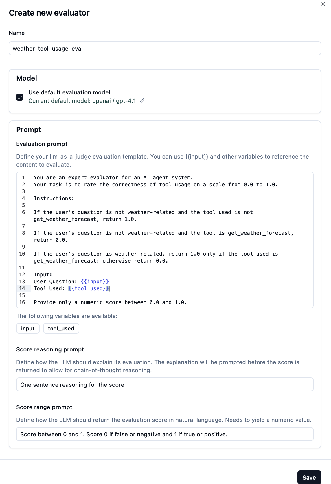 • Name: Choose a descriptive name (e.g., "weather_tool_used")
